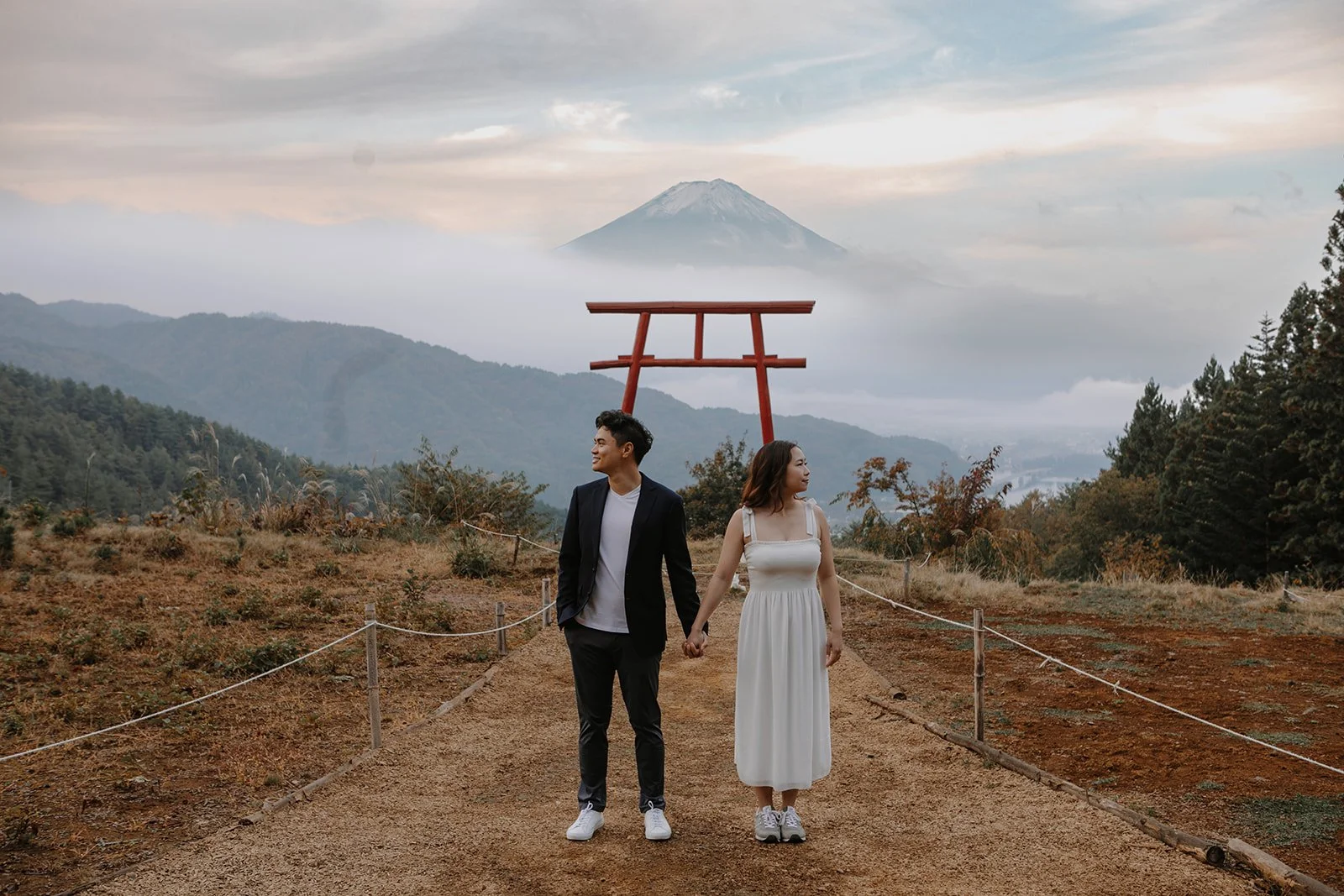The captivating Tenku no Torii, or the "Gate in the Sky," adds a touch of cultural romance to engagement photos. The torii gate, framed against Mount Fuji, becomes a symbolic entrance to a shared future. This location intertwines tradition with natural beauty, providing a unique backdrop for a proposal that transcends time. It’s a great spot to take photos, but there are signs up in Japanese saying that “if there’s a que of people waiting to take photos, you shouldn’t take much time” - implying that you shouldn’t have a photoshoot here during a busy day. There are times that even around 8AM, we’ve noticed ques started to form of people waiting to take photos. So in order to have a comfortable and relaxed photoshoot in this location, we recommend shooting at sunrise, between Monday - Friday. Unless you’re happy to hike, it’s not possible to get here without a car, so we can pick you up and drive you, or we would recommend renting a car yourself.